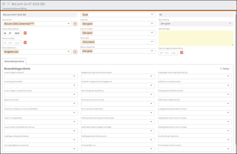 Inkoop+ biedt functionaliteit voor de beoordeling van leveranciers. Elke leverancier kan periodiek worden beoordeeld. Bij elke leveranciersbeoordeling wordt op basis van een aantal hoofdcriteria een score berekend. Er is ook een uitgebreide lijst met detailcriteria beschikbaar. Echter, enkel de hoofdcriteria zijn bepalend voor de overall-score.
