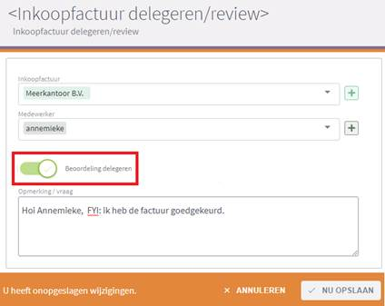 Kies de medewerker aan wie de factuur gedelegeerd dient te worden. Zorg dat het schuifje “Beoordeling delegeren” groen aangevinkt is, motiveer waarom de factuur gedelegeerd moet worden en sla de wijzigingen op.