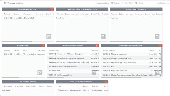 ·     Openstaande offertes: In deze lijst staan alle offertes van leveranciers die meedoen in actieve inkooptrajecten die nog in behandeling zijn.