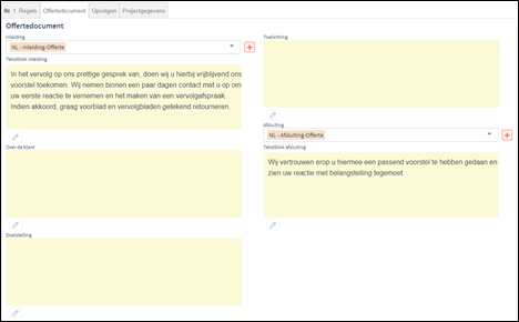 De gegenereerde offerte wordt aangemaakt door gebruik te maken van een Word merge-template. Deze template wordt specifiek per klant gemaakt en bevat ook de huisstijl van de klant. Het is mogelijk om het aangemaakte bestand verder te bewerken en definitief te maken. Natuurlijk is het ook mogelijk dat de offerte in een los document wordt aangemaakt en als bijlage aan de verkoopkans wordt toegevoegd.